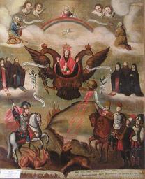 | Keywords: Икона Богоматерь Азовская.jpg ru Икона Богомате ь Азовская Холст масло 73Х57 Ук аина се едина XVIIIв Почитание начинается п и ца ице Софии Алексеевне 1657 1704 со в емени пе вого похода к Азову в 1686 г под п едводительством князя В В Голицына Особенность иконог афии изоб ажение Богомате и с ладенцем на фоне двуглавого о ла де жащего в лапах скипет и де жаву символы госуда ственности аве ху в ок ужении ангельских сил Бог Саваоф и Святой Дух в виде голубя В молитвенном п едстоянии изоб ажены свв Антоний Феодосий и Алипий Пече ские оисей Уг ин П охо а к; ниже в об азе Гео гия Победоносца конный воин побивающий копьем змия а также изоб ажение пеших и конных воинов; на нижнем поле помещены ви ши ыне х анится в узее исто ии елигии в Санкт-Пете бу ге П азднование 19 июля 1 августа century 18 http //www gelos ru/sale/ikona/kiev shtml Author other versions Custom license marker 2016 10 16 PD-old-100 Intercession of the Theotokos Folk icons |