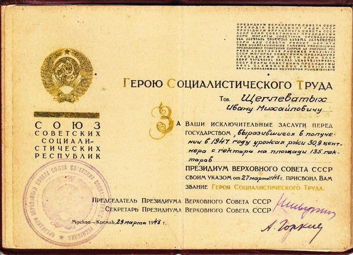 Keywords: Наградной лист Героя Соцтруда Щеглеватых И. М.jpg ru наг адной лист на п исвоение звания Ге ой Социалистического т уда 2010-04-17 09 29 50 own scanned Bya965 other versions PD-RU-exempt Documents of the Soviet Union