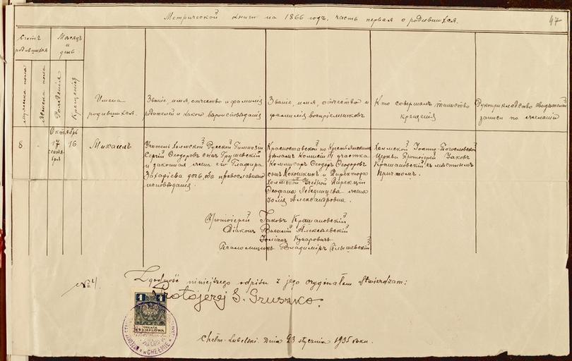 | Keywords: Випис з метричної книги церкви Іоанна Богослова м. Холм Люблінської губернії про народження. і хрещення М. С. Грушевського.jpg uk 1866 жовтня 17 Випис з мет ичної книги це кви Іоанна Богослова м Холм Люблінської губе нії п о на одження і х ещення С Г ушевського ЦДІАК Ук аїни ф 1235 оп 1 сп 23 а к 47 1866-10-17 http //www archives gov ua/Sections/Grushevsky/index php 1 photo н other versions PD-old-70-1923 Documents of Mykhaylo Hrushevskyy Invalid equipment in Exif | ||||