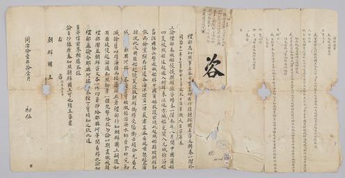 | Keywords: 조선-청 외교문서(자문) 228.jpg 고종 9년 1872 11월 5 에 청국 예 에 조선국왕에게 보내 온 문 조선 경내에 비적선 匪賊船 에 쫓겨 온 중국 상선 4척 보호하고 비적 격파하느 고 조선 군사 사상 死傷 되었다는 조선국왕 보고에 하여 산동 무사 山 巡撫使 에게 명하여 해적들 소탕하도 명 내렸 알리는 문 다 2016-07-19 http //www nl go kr/nl/search/SearchDetail nl category_code ct service KOLIS vdkvgwkey 1130367 colltype DAN_OLD place_code_info 172 place_name_info EB 94 94 EC A7 80 ED 84 B8 EC 97 B4 EB 9E 8C EC 8B A4 manage_code MA shape_code B refLoc null category srchFlag Y h_kwd E5 8F A4 E6 9C 9D51- EB 8B A428-306 lic_yn N mat_code RB 국립중앙도 조선국왕 청국예 other versions PD-Art Books from National Library of Korea Books from Korea 1872 in Relations of the Joseon Dynasty and the Qing Dynasty |