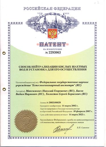Keywords: Патент способ нейтрализации кислых шахтных вод.jpg ru 2007 2016-04-11 own Nmax54 other versions Boris Simonov Signature png PD-RU-exempt Insignia cc-by-sa-4 0 Documents Signed by Boris Simonov Patent Certificates from Russia