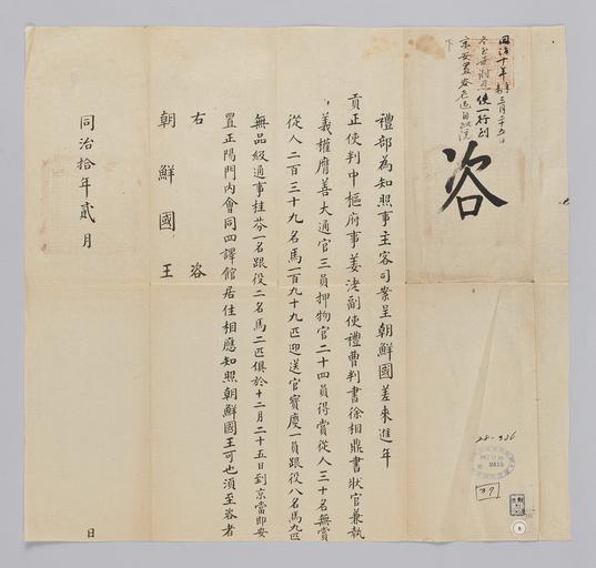 | Keywords: 조선-청 외교문서(자문) 303.jpg 고종 8년 1871 2월에 청국 예 에 조선국왕에게 보내 온 문 조선에 파견 동 겸 사 사 정사 강노 사 상정 장 권 선 등 사신 행 작년 12월 25 에 북경에 도착하여 회동 同 사역 四譯官 에 머물고 있 알리는 내용 다 2016-07-19 http //www nl go kr/nl/search/SearchDetail nl category_code ct service KOLIS vdkvgwkey 1130405 colltype DAN_OLD place_code_info 172 place_name_info EB 94 94 EC A7 80 ED 84 B8 EC 97 B4 EB 9E 8C EC 8B A4 manage_code MA shape_code B refLoc null category srchFlag Y h_kwd E5 8F A4 E6 9C 9D51- EB 8B A428-386 lic_yn N mat_code RB 국립중앙도 조선국왕 청국예 other versions PD-Art Books from National Library of Korea Books from Korea 1871 in Relations of the Joseon Dynasty and the Qing Dynasty |