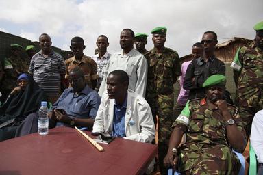 | Keywords: amisom army kismayu militia men militiamen surrender outdoor Militia men surrendered to AMISOM troops on 6th January 2014 in Kismayu as General Raria of Amisom listens on. AU UN IST PHOTO / Ramadaan Mohamed Militia men surrendered to AMISOM troops on 6th January 2014 in Kismayu as General Raria of Amisom listens on. AU UN IST PHOTO / Ramadaan Mohamed |