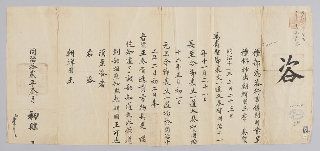 | Keywords: 조선-청 외교문서(자문) 320.jpg 고종 10년 1873 3월 4 에 청국 예 에 조선국왕에게 보내 온 문 조선국왕 보낸 만수성절 문 萬壽聖 表文 장 령절 문 長至令 表文 원단령절 문 元旦令 表文 등 삼절 三 문 황 에게 올렸 알리는 내용 다 2016-07-19 http //www nl go kr/nl/search/SearchDetail nl category_code ct service KOLIS vdkvgwkey 1130347 colltype DAN_OLD place_code_info 172 place_name_info EB 94 94 EC A7 80 ED 84 B8 EC 97 B4 EB 9E 8C EC 8B A4 manage_code MA shape_code B refLoc null category srchFlag Y h_kwd E5 8F A4 E6 9C 9D51- EB 8B A428-404 lic_yn N mat_code RB 국립중앙도 조선국왕 청국예 other versions PD-Art Books from National Library of Korea Books from Korea 1873 in Relations of the Joseon Dynasty and the Qing Dynasty |