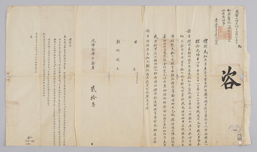 Keywords: 조선-청 외교문서(자문) 344.jpg 고종 25년 1888 10월 23 에 청국 예 에 조선국왕에게 보내 온 문 조선에 파견 재자 등 사신 고 온 홍삼 紅蔘 에 해 면세 다고 알리는 내용 다 2016-07-20 http //www nl go kr/nl/search/SearchDetail nl category_code ct service KOLIS vdkvgwkey 1129973 colltype DAN_OLD place_code_info 172 place_name_info EB 94 94 EC A7 80 ED 84 B8 EC 97 B4 EB 9E 8C EC 8B A4 manage_code MA shape_code B refLoc null category srchFlag Y h_kwd E5 8F A4 E6 9C 9D51- EB 8B A428-488 lic_yn N mat_code RB 국립중앙도 조선국왕 청국예 other versions PD-Art Books from National Library of Korea Books from Korea 1888 in Relations of the Joseon Dynasty and the Qing Dynasty |