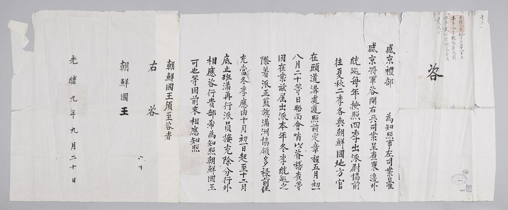 | Keywords: 조선-청 외교문서(자문) 347.jpg 고종 20년 1883 9월 20 에 청국 예 에 조선국왕에게 보내 온 문 올해 10월 1 터 12월까 동계 통 에 만주 滿州 협령 協領尉 다 多祿 파견 다고 알리는 내용 다 2016-07-20 http //www nl go kr/nl/search/SearchDetail nl category_code ct service KOLIS vdkvgwkey 1130175 colltype DAN_OLD place_code_info 172 place_name_info EB 94 94 EC A7 80 ED 84 B8 EC 97 B4 EB 9E 8C EC 8B A4 manage_code MA shape_code B refLoc null category srchFlag Y h_kwd E5 8F A4 E6 9C 9D51- EB 8B A428-495 lic_yn N mat_code RB 국립중앙도 조선국왕 청국예 other versions PD-Art Books from National Library of Korea Books from Korea 1883 in Relations of the Joseon Dynasty and the Qing Dynasty |