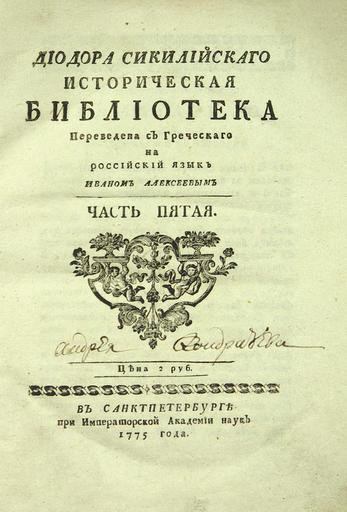 | Keywords: Диодор Титул.jpg  ru Титульный лист книги Диодо а Сикилийсаго Исто ическая библиотека 1775 Книга Диодо а Сицилийскаго Исто ическая библиотека Пе еведена иваном Алексеевым СПб 1775 Диодо Сицилийский / Издательство Импе ато ской Академии  аук PD-RusEmpire Books by Diodorus Siculus Books from Russia 1775 Books published in Saint Petersburg |