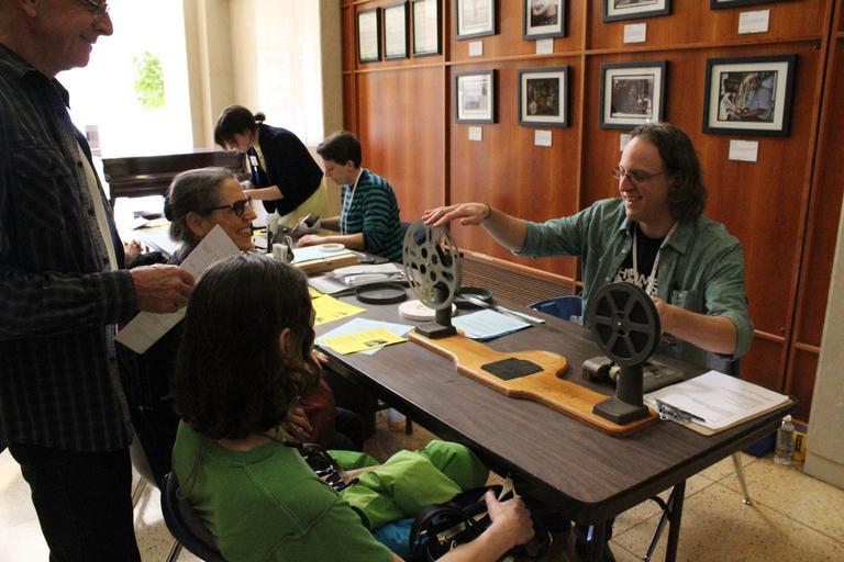 Keywords: Film inspection. Film owners discuss their films with K Sean before the film is taken into the theater to be screened. Home Movie Day 2015 in Raleigh, NC. Saturday, October 17, 2015, at the State Archives of North Carolina. Photo by Georgia Ponton. Film inspection. Film owners discuss their films with K Sean before the film is taken into the theater to be screened. Home Movie Day 2015 in Raleigh, NC. Saturday, October 17, 2015, at the State Archives of North Carolina. Photo by Georgia Ponton.