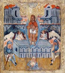 | Keywords: Остання чверть XVI ст. Галичина. Дошка липова, левкас, темпера, тиснення, сріблення. 70 х 52 х 2. The Resurrection. Last quarter of the 16th c. Tempera, silvering on gesso-grounded two-piece hollowed lime-wood panel, stamping. Національний художній музей України. Альбом. Київ, "Артанія Нова", 2003 |