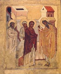 | Keywords: Перша пол. XVI ст. Галичина. Дошка липова, левкас, темпера, сріблення, тиснення на полях. 79 х 68 х 2,5. The Presentation. First half of the 16th c. Galychyna. Tempera, silvering on gesso-grounded two-piece lime-wood panel, border stamping. Національний художній музей України. Альбом. Київ, "Артанія Нова", 2003 |