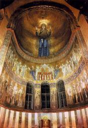 | Keywords: Софія Київська, XI ст. Мозаїка у центральній апсиді. Центр мозаїчних композицій становить головна апсида. Величаве зображення Богородиці (5,45 м) - найбільше у давньоруському мистецтві, виступає на суцільному золотому тлі. Її мафорій* просякнутий золотими променями (золото - символ божественного світла і безмежного простору). Богородиця панує над центральною навою, уособлюючи "церкву земну" та заступницю перед Пантократором. У середньому поясі апсиди - велика монументальна композиція - "Євхаристія". По центру обабіч престолу з киворієм** стоять ангели з рипідами***, і Христос у двох іпостасях причащає апостолів, які підходять до нього справа та зліва, хлібом і вином, перетвореними чудесним способом у тіло і кров Христову. Апостоли зображені на золотому тлі без позему, що створює ілюзію безмежного простору. Вони ніби пронизані наскрізь світлом, перебуваючи в містичній атмосфері літургійного дійства, яке їх цілковито захопило величчю духовної радості. * мафорій - покривало заміжніх жінок; ** киворій - купол над престолом, що підноситься на колонах; предмет для зберігання святих дарів; *** рипіди - променеві кола, опахала, віяла. Д.П. Крвавич, В.А. Овсійчук, С.О. Черепанова - Українське мистецтво, т.2, Львів, "Світ", 2004. - с. 145, іл. 181 |