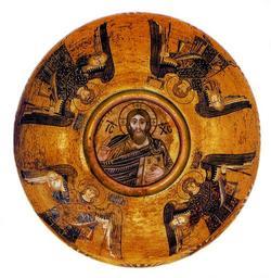 | Keywords: Софія Київська, XI ст. Мозаїка головної бані. Зображення Пантократора, уособлення "церкви небесної", символу влади, що панує над усім світом, виконано великими кольоровими площинами: пронизані золотистими штрихами пурпуровий хітон і блакитний гіматій. Його півпостать вирізнається могутністю і первозданою силою, а погляд сповнений непідступною суворістю. Книга, яку він підтримує лівою рукою, нагадує про страшний суд (коли вона буде відкрита згідно з апокаліптичним пророкуванням). Христа оточує дев'ять кольорових кіл, що символізують дев'ять небесних сфер. Д.П. Крвавич, В.А. Овсійчук, С.О. Черепанова - Українське мистецтво, т.2, Львів, "Світ", 2004. - с. 145, іл. 179. |