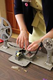 Keywords: Film inspection. Home Movie Day 2015 in Raleigh, NC. Saturday, October 17, 2015, at the State Archives of North Carolina. Photo by Georgia Ponton. Film inspection. Home Movie Day 2015 in Raleigh, NC. Saturday, October 17, 2015, at the State Archives of North Carolina. Photo by Georgia Ponton.