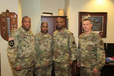 | Keywords: Right to left: IMCOM Command Sergeant Major Jeffrey Hartless, U.S. Army Human Resources Command Command Sgt. Maj. Wardell Jefferson, IMCOM G1 Sgt. Maj. Culbreath and U.S. Army North G1 Sgt. Maj. Bowens. Maj. Gen. Thomas C. Seamands, commanding general, U.S. Army Human Resources Command and Command Sgt. Maj. Wardell Jefferson, command sergeant major of the U.S. Army Human Resources Command, visited IMCOM headquarters for meetings with Maj. Gen. Lawarren Patterson, IMCOM deputy commanding general and chief of staff, and IMCOM Command Sergeant Major Jeffrey Hartless, Jan. 6, 2016. Also attending were IMCOM G1 Sgt. Maj. Culbreath and the U.S. Army North G1 Sgt. Maj. Bowens. U.S. Army IMCOM photos by Neal Snyder. |