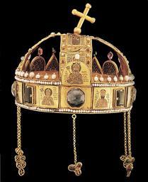 Keywords: Корона св. Стефана.jpg ru 13 Ко она св Стефана со вставками ихаил VII Дука цент его сына Константин слева и ко оль Венг ии Геза сп ава 1074-1077 Будапешт own Maxim91 century 11 Holy Crown of Hungary Greek letters Michael VII Doukas
