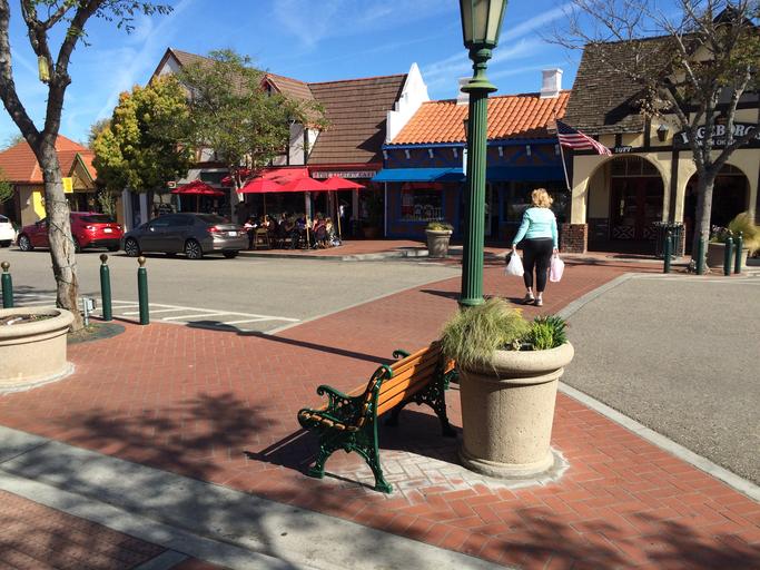 Keywords: crosswalk walkability ada midblock midblockcrossing street road bench sidewalk pedestrian solvang streetlighting streetlight streetfurniture planter bollard brick