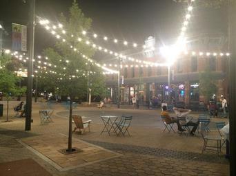 Keywords: plaza outdoorseating publicspace square nightlife moveableseating lighting permeablepaving permeable pavers brick downtown walkability fortcollins streetfurniture