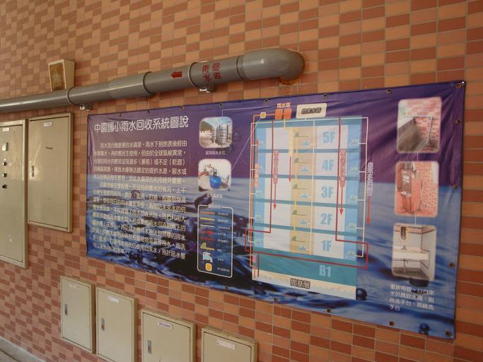 Keywords: 雨水回收系統.JPG zh-tw 雨水回收系統說明牌與雨水管㠂 own 余徹鵬 2010-09-21 Jhong Yuan Elementary School Rainwater harvesting