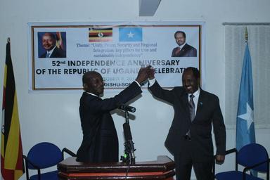 | Keywords: Somali President, Hassan Sheikh Mohamud, toasts Uganda with the country's Ambassador to Somalia, Maj. Gen. Nathan Mugisha, during the celebration of Uganda's 52nd anniversary of independence on October 9, 2014. AMISOM Photo / Abdi Dagane Somali President, Hassan Sheikh Mohamud, toasts Uganda with the country's Ambassador to Somalia, Maj. Gen. Nathan Mugisha, during the celebration of Uganda's 52nd anniversary of independence on October 9, 2014. AMISOM Photo / Abdi Dagane | ||||