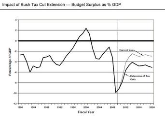 | Keywords: Impact of Bush Tax Cut Extension.png Impact of permanent Bush tax cut extension including estate tax<br/> Overview Permanent extension of the Bush tax cuts adds about 2 of GDP to the deficit The following two quotes are included in a September 2010 Congressional Research Service CRS report <ref>http //fpc state gov/documents/organization/148790 pdf Congressional Research Service-The Bush Tax Cuts and the Economy-September 2010</ref> Figure 5 displays the trend in federal deficits as a percentage of GDP from 1980 to 2020 Under current law the federal deficit is projected to decline from 9 2 of GDP in 2010 to 3 of GDP by 2020 If all the Bush tax cuts are permanently extended including the repeal of the estate tax the deficit is projected to be 5 1 of GDP in 2020 and on a clearly unsustainable path of increasing deficits Neither of the projections take into consideration likely annual changes to the alternative minimum tax AMT with a projected 10-year cost of about 1 500 billion The Bush tax cuts are scheduled to expire at the end of 2010 and the tax parameters revert back to their 2000 values the current law baseline Some policymakers have proposed to permanently extend the Bush tax cuts CBO estimates that permanently extending the tax provisions of EGTRRA and JGTRRA would increase the deficit by 1 215 billion over five years and by 3 312 billion over 10 years Congressional Research Service Congressional Research Service / Uploaded by Farcaster talk 17 13 12 December 2010 UTC economy Reflist PD-USGov Original upload log en wikipedia Impact+of+Bush+Tax+Cut+Extension png 2012-03-08 22 58 Chris3145 960×720× 97892 bytes Changed title as explained on talk page 2012-03-08 22 57 Chris3145 960×720× 97892 bytes Changed title as explained on talk page 2010-12-12 17 06 Farcaster 960×720× 80649 bytes ~~~~~ Uncategorized 2014 May 23 |