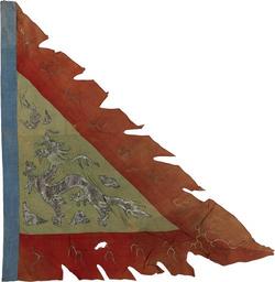 | Keywords: Imperial Chinese junk flag.jpg An Imperial Chinese junk flag captured during the First China War 1839-42 It is part of a collection belonging to Sir Robert Oliver 1783-1848 Superintendent of the Indian Navy The flag is made of silk with a cotton hoist and is hand sewn It is a triangular shape coloured green with a blue hoist and red indented border There is a silver and gold dragon and pearl motif in the centre surrounded by clouds ” the dragon has four toes Lightning flashes are shown in the borders The flag was used by the Commander-general of Guards Brigade of the Eight Banners 1842 http //collections rmg co uk/collections/objects/518 html author PD-Art-100 First Opium War Flags of the Qing Dynasty Dragons chasing a flaming pearl Collections of the National Maritime Museum London |
