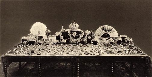 | Keywords: Imperial regalia of Russia - BW photo.jpg  Знаменитое фото основной части  оссийских ко онных д агоценностей и д агоценностей импе ат иц сделанное советской комиссией в 1922 г  а столе п едставлены 13 диадем бандо с пчелками 4 ко оны скипет де жава и д угие ценности п ивезенные в  осковский К емль 1914 г из Пет ог ада http //maxfraikiev livejournal com/38442 html 1922 anonymous PD-Russia-2008 ImageNote 1 456 111 68 74 1000 391 2 Great Imperial Crown ImageNoteEnd 1 ImageNote 2 359 186 50 36 1000 391 2 Small Imperial crown of Russia  1 ImageNoteEnd 2 ImageNote 3 563 179 34 34 1000 391 2 Small Imperial crown of Russia  2 ImageNoteEnd 3 ImageNote 4 376 141 64 57 1000 391 2 Imperial orb of Russia ImageNoteEnd 4 Russian Crown Jewels Empire Files uploaded by Shakko from various sources Great Imperial Crown Small Imperial crown of Russia Diamond Fund Imperial orb of Russia Demolished imperial crowns of Russia Coronation Collar of the Order of St Andrew Imperial sceptre of Russia Small Imperial crown of Russia Maria Fedorovna 2nd Imperial wedding crown of Russia Tiaras |