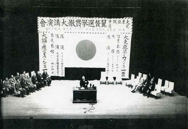 Keywords: Imperial Rule Assistance Election Speech.JPG Imperial Rule Assistance Election Speech 翼賛選挙貫徹大講演会 Japanese book Showa History Vol 9 Battlefront and Home front published by Mainichi Newspapers Company 毎日新聞社 昭和史第9巻 戦線と銃後 より Year 1942 1942年 author Notes This file was scanned and edited by the uploader Abasaa ファイルはあばさーによりスキャンおよび編集されました PD-Japan-oldphoto Japanese general election 1942 Imperial Rule Assistance Association |