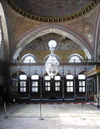 | Keywords: Imperial Sofa Topkapi March 2008pano.jpg Interior of the Imperial Hall Hünkar Sofası at Topkapi Palace in Istanbul The upper gallery was reserved for the ladies and the Queen Mother while the Sultan himself sat on the throne Own 2008-03 Gryffindor Imperial Hall Topkapı Palace Building interiors in Turkey Interiors of halls |
