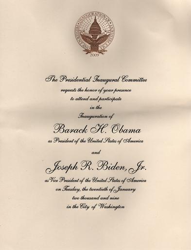 | Keywords: Inaugural invitation 2009.png en Invitation to the 2009 Presidential Inauguration of Barack Obama Scanned at 600dpi in 24bit color Slightly folded by the U S Postal Service Scanned at 600dpi color on an Epson Stylus CX3810 with Xsane version 0 99+0 991-2 Debian GNU/Linux 4 0r6 Extracted from the PDF with pdfimages of the pdf-tools package version 3 01-9 1+etch5 Converted from ppm to png with 'convert -quality 100 inaugural_invitation_2009 ppm inaugural_invitation_2009 png' from the imagemagick package version 7 6 2 4 5 dfsg1-0 14 Presidential Inaugural Committee Karl O Pinc file Presidential Inaugural Committee original Jan 12 2009 file 2008 original <gallery> File Inaugural invitation 2009 72dpi png File Inaugural invitation 2009 72dpi png </gallery> PD-USGov Barack Obama 2009 presidential inauguration |