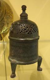 | Keywords: Incense burner, Syria, Damascus, 1264-1279, engraved brass, silver inlay - Royal Ontario Museum - DSC04766.JPG en Exhibit in the Royal Ontario Museum Toronto Ontario Canada This work is old enough so that it is in the public domain Photography was permitted in the museum without restriction 2013-10-08 17 19 37 own Daderot cc-zero Uploaded with UploadWizard Metalwork of Syria in the Royal Ontario Museum | ||||