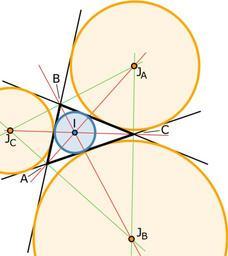 | Keywords: Incircle and Excircles.svg Diagram to shown the construction of the incenter blue I the incircle blue the excentres orange J<sub>A</sub> J<sub>B</sub> J<sub>C</sub> and the excircles orange Self-Made using Inkscape 08/05/2007 Inductiveload Incircle and excircles SVG geometry Incenter |