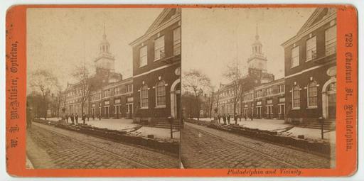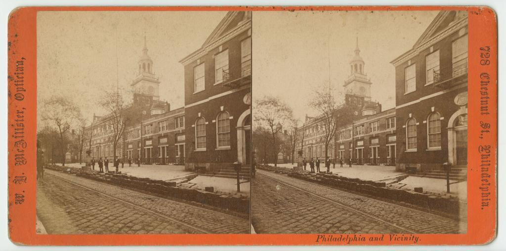 | Keywords: philadelphia pennsylvania congress hall independence hall independencehall chestnut street chestnutstreet stereographs albumen prints andrew hamilton andrewhamilton edmund linkwoolley edmundlinkwoolley photo border View looking southeast at the front of Independence Hall built 1732-1748 after the designs of Andrew Hamilton and Edmund Woolley at 520 Chestnut Street. Shows a partial view of Congress Hall built 1787-1789 (540-558 Chestnut) and the Prothonotary Office and Court of Common Pleas. Also includes a group of men standing on the sidewalk and piles of stones lining the street in the foreground. Albumen on stereograph mount. View looking southeast at the front of Independence Hall built 1732-1748 after the designs of Andrew Hamilton and Edmund Woolley at 520 Chestnut Street. Shows a partial view of Congress Hall built 1787-1789 (540-558 Chestnut) and the Prothonotary Office and Court of Common Pleas. Also includes a group of men standing on the sidewalk and piles of stones lining the street in the foreground. Albumen on stereograph mount. |