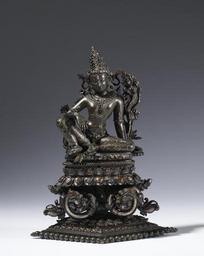 | Keywords: Indian - Bodhisattva Maitreya - Walters 543080.jpg This sumptuous bodhisattva is the future Buddha Maitreya recognizable by the small pot resting on the lotus stem and by the stupa nearly hidden in his elaborate headdress Solid dome-shaped structures called stupas sometimes hold relics of the Buddha Shakyamuni It can be imagined that Maitreya is honoring Shakyamuni by placing his relics on his head Originally the sculpture flanked a statue of Shakyamuni with the bodhisattva Avalokiteshvara on the other side An inscription on the base names the elderly monk Sadhurakshita donor of this image to a monastery century 12 bronze with silver and copper inlay cm 18 4 14 7 6 accession number 54 3080 843 John and Berthe Ford Baltimore date and mode of acquisition unknown Walters Art Museum John Berthe Ford 2009 under base place of origin Bihar India Walters Art Museum license Art of India in the Walters Art Museum Media contributed by the Walters Art Museum needs category review |