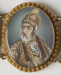 | Keywords: Indian - Bracelet with Portrait Miniatures - Walters 38665 - Detail C.jpg The six segments of this bracelet feature miniature portraits of three Mughal emperors and their consorts Indian artists adopted the technique of painting portrait miniatures on ivory with watercolors from British artists living and working in India during the 19th century This delicate bracelet is therefore an interesting example of the cultural exchange between East and West during the period of European imperialism between 1860 1870 watercolor on ivory gold cm 19 1 accession number 38 665 14966 John D Schapiro Monkton Maryland Mrs Jerry Cascarella date and mode of acquisition unknown Walters Art Museum Gift of Mrs Jerry Cascarella 1999 Bedazzled 5 000 Years of Jewelry from the Walters Art Museum Frist Center for the Visual Arts Nashville; The John and Mable Ringling Museum of Art Sarasota; The Walters Art Museum Baltimore 2006-2009 place of origin Delhi India Walters Art Museum license 3D Mughal art in the Walters Art Museum Jewellery in the Walters Art Museum Portrait miniatures in the Walters Art Museum |