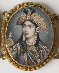 | Keywords: Indian - Bracelet with Portrait Miniatures - Walters 38665 - Detail D.jpg The six segments of this bracelet feature miniature portraits of three Mughal emperors and their consorts Indian artists adopted the technique of painting portrait miniatures on ivory with watercolors from British artists living and working in India during the 19th century This delicate bracelet is therefore an interesting example of the cultural exchange between East and West during the period of European imperialism between 1860 1870 watercolor on ivory gold cm 19 1 accession number 38 665 14966 John D Schapiro Monkton Maryland Mrs Jerry Cascarella date and mode of acquisition unknown Walters Art Museum Gift of Mrs Jerry Cascarella 1999 Bedazzled 5 000 Years of Jewelry from the Walters Art Museum Frist Center for the Visual Arts Nashville; The John and Mable Ringling Museum of Art Sarasota; The Walters Art Museum Baltimore 2006-2009 place of origin Delhi India Walters Art Museum license 3D Mughal art in the Walters Art Museum Jewellery in the Walters Art Museum Portrait miniatures in the Walters Art Museum |