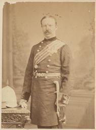 | Keywords: Indian Celebrities- General Dunham Massy WDL11438.png Artwork ru Индийские знаменитости Гене ал Данхэм эсси fr Personnages célèbres de l'Inde général Dunham Massy en Indian Celebrities General Dunham Massy zh 印度名人:邓纳姆·梅西将军 pt Celebridades indianas General Dunham Massy ar مشاهير هُنود الجنرال دنهام ماسي ru Этот по т ет гене ала Данхэма эсси 1838 1906 гг входит в альбом едких исто ических фотоснимков на кото ых изоб ажены люди и места связанные со Вто ой англо-афганской войной а фотог афии гене ал изоб ажен в полный ост ядом со своим ост оконечным т опическим шлемом В октяб е 1879 года эсси в чине подполковника успешно уководил кавале ийским от ядом в битве п и Ча асьябе однако впоследствии был отст анен от командования кавале ией по п ичине неудачного уководства д угой военной опе ацией с ажением под Килла-Кази в декаб е того же года Ему удалось восстановить свое положение и в 1886 году он благода я безуп ечной службе на посту команди а полка и подде жке влиятельных пок овителей в Лондоне был повышен в звании до гене ал-майо а В пе иод б итанского господства 1858 1947 годов выдающихся б итанских должностных лиц и военнослужащих часто называли индийскими знаменитостями Вто ая англо-афганская война началась в нояб е 1878 года когда Великоб итания опасаясь как ей казалось астущего влияния России в Афганистане вто глась в эту ст ану с те ито ии Б итанской Индии Пе вый этап войны закончился в мае 1879 года подписанием Гандамакского догово а позволившего афганцам сох анить внут енний суве енитет однако заставившего их уступить конт оль над внешней политикой своей ст аны б итанцам Военные действия возобновились в сентяб е 1879 года после антиб итанского восстания в Кабуле и окончательно заве шились в сентяб е 1880 года ешающей битвой за Кандага Данный альбом включает по т еты б итанских и афганских лиде ов и военнослужащих фотог афии п остых афганских людей изоб ажения б итанских военных лаге ей военных действий ст оений пейзажей к упных и небольших го одов Все изоб аженные на фотоснимках места находятся на те ито ии сов еменных Афганистана или Пакистана в то в емя бывших частью Б итанской Индии Около т ети п едставленных в альбоме фотог афий выполнены Джоном Бе ком около 1843 1900 гг д угая т еть сэ ом Бенджамином Симпсоном 1831 1923 гг а оставшаяся часть несколькими д угими фотог афами Авто ы некото ых фотоснимков неизвестны Возможно что составителем альбома был один из членов б итанского п авительства в Индии однако это п едположение не подтве ждено Каким об азом альбом попал в Библиотеку Конг есса неизвестно <br>Афганские войны; эсси Уильям Годф и Данхэм 1838 1906 гг ; Офице ы; Военная фо ма; По т етные фотог афии; По т еты fr Ce portrait du général Dunham Massy 1838 1906 est extrait d'un album de photographies historiques rares de personnalités et de sites associés à la seconde guerre anglo-afghane Massy pose ici près de son casque colonial à pointe Lieutenant-colonel Massy commanda avec brio une brigade de cavalerie pendant la bataille de Char-Asiab en octobre 1879 Toutefois il fut par la suite réprimandé et démis de cette fonction pour avoir échoué lors d'un autre affrontement la bataille de Killa Kazi en décembre de la même année Il surmonta cette destitution et il atteignit en 1886 le grade de major-général grâce à ses états de service exemplaires en tant que commandant de régiment et à l'appui de ses puissants mécènes à Londres Pendant le Raj britannique de 1858 à 1947 les militaires et les administrateurs coloniaux de haut rang étaient souvent considérés comme des célébrités « indiennes » La seconde guerre anglo-afghane commença en novembre 1878 lorsque la Grande-Bretagne se sentant menacée par l'influence croissante des Russes en Afghanistan envahit le pays depuis l'Inde britannique La première phase de la guerre s'acheva en 1879 avec le traité de Gandamak qui permit aux Afghans de conserver leur souveraineté nationale mais les força à céder le contrôle de leur politique étrangère aux Britanniques Les co