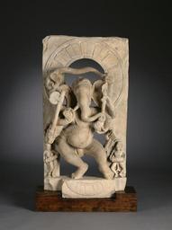 | Keywords: Indian - Dancing Ganesha - Walters 25253.jpg After Shiva decapitated his son in a fit of anger the boy's life was restored when an elephant's head was joined to his body Like his father Ganesha combines opposing traits he is a leader of Shiva's troops but he is also lovable there is a bowl of sweets beneath the tip of his trunk He dances in imitation of his father's cosmic dance Ganesha became the lord of beginnings for Hindus and is prayed to at the start of an endeavor Images such as this one were placed in the southern exterior niche of a temple to be encountered first in a ritual walk around the outside of the temple century 9 10 sandstone cm 74 9 40 6 14 accession number 25 253 28127 Ramesh Kapoor New York date and mode of acquisition unknown John Ford New York July 25 1983 by purchase Walters Art Museum John Berthe Ford 2004 Desire and Devotion Art from India Nepal and Tibet in the John and Berthe Ford Collection The Walters Art Museum Baltimore; Birmingham Museum of Art Birmingham; Santa Barbara Museum of Art Santa Barbara; Albuquerque Museum Albuquerque 2001-2003 place of origin Uttar Pradesh India Walters Art Museum license Hindu art in the Walters Art Museum Media contributed by the Walters Art Museum needs category review Dancing Ganesha in sculpture 9th-century art of India Sculptures from Uttar Pradesh |