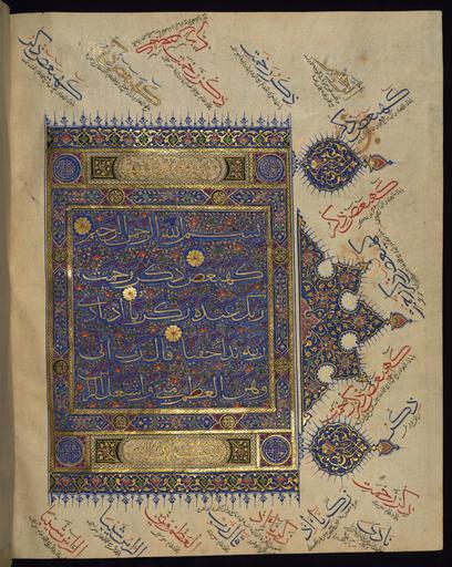 | Keywords: Indian - Double-page Illuminated Incipit - Walters W563274B - Full Page.jpg This folio from Walters manuscript W 563 is the right side of a double-page illuminated incipit introducing chapter 19 Surat Maryam The text is written in gold Muhaqqaq script outlined in black with vocalization in red and counters filled in in red and green The ground is decorated with floral motifs The margins contain various phrases and words with explanations of their readings according to different reciters 9th century AH/AD 15th century Timurid ink and pigments on thin laid paper cm 40 31 accession number W 563 274B 81375 Sultan 'Uthman Khan date and mode of acquisition unknown erased bequest waqf statement and stamp on fol 3a Sultan Bayezid II date and mode of acquisition unknown seal on fol 8a Dikran Kelekian New York and Paris date and mode of acquisition unknown Henry Walters Baltimore date of acquisition unknown by purchase Walters Art Museum Henry Walters Acquired by Henry Walters place of origin northern India Walters Art Museum license 2D Mughal manuscripts in the Walters Art Museum Media contributed by the Walters Art Museum needs category review |
