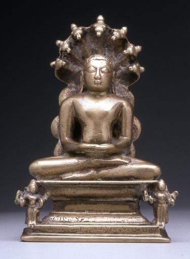 | Keywords: Indian - Jina Parshvanatha with Attendants - Walters 543013.jpg This image portrays the Jina Parshvanatha who is distinguished from the other twenty-three Jinas of the Jain pantheon by the seven-hooded snake that forms a canopy over his head Otherwise he does not differ from the others and typically is an impassive naked figure seated in the classic posture of meditation with his hands placed on his lap in a gesture of contemplation dhyanamudra The nudity of the figure indicates that the donor unnamed in the dedicatory inscription belonged to the Digambara sky-clad order of Jainism which predominates in Karnataka Parshvanatha is one of the twenty-four Jinas or liberated teachers worshipped by the Jains Various tutelary and protective divinities of both sexes are also worshipped but they are subservient to the twenty-four Jinas Hence two such deities are represented here as diminutive figures standing in attendance in front of the tiered base The male on the Jina's right is Dharana and the female opposite is Padmavati Although called yaksha and yakshi rather than deva or devi like the Hindu or Buddhist deities they have multiple limbs and are venerated in a similar fashion 1589 brass cm 22 2 accession number 54 3013 17363 John and Berthe Ford Baltimore date and mode of acquisition unknown Walters Art Museum John Berthe Ford 2002 Inscr effaced Desire and Devotion Art from India Nepal and Tibet in the John and Berthe Ford Collection The Walters Art Museum Baltimore; Birmingham Museum of Art Birmingham; Santa Barbara Museum of Art Santa Barbara; Albuquerque Museum Albuquerque 2001-2003 place of origin Karnataka India Walters Art Museum license Art of India in the Walters Art Museum Media contributed by the Walters Art Museum needs category review Parshvanatha |