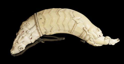 | Keywords: Indian - Powder Flask - Walters 71419.jpg The powder flask also known as a priming flask was an essential firearm accessory and held the fine powder needed to make the gun fire Gunmakers in India during the Mughal era 1526-1858 specialized in carving ivory powder flasks with animal figures Often as these two examples the decoration consists of intertwined and composite creatures that seem to grow out of or attack one another One such menagerie on the right-hand flask includes a cheetah or lion chasing an antelope in the center and bucks antelopes lions birds a boar elephant and mongoose at the two ends Many of these animals were regularly hunted or used for hunts as with the elephant in Mughal India century 18 Early Modern ivory set with amber steel cm 6 2 16 2 2 5 accession number 71 419 40388 Max and Maurice Rosenheim date and mode of acquisition unknown Sale Sotheby's London May 9-11 1923 lot 304 Henry Walters Baltimore 1923 mode of acquisition unknown Walters Art Museum Henry Walters Acquired by Henry Walters 1923 place of origin India Walters Art Museum license Weapons in the Walters Art Museum Indian gunpowder flasks Mughal art in the Walters Art Museum Media contributed by the Walters Art Museum needs category review |