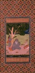Keywords: Indian - Single Leaf of Shah Sarmad and Prince Dara Shikoh - Walters W912.jpg According to inscriptions written in Nasta'liq script this painting Walters manuscript leaf W 912 depicts the Mughal prince Dara Shikoh born 1024 AH/AD 1615 and the holy man Shah Sarma seated under a tree Behind the wise man stands an attendant with a peacock-feather fan A celebrated scholar sufi and ruler Dara Shikoh was the eldest son of Shah Jahan On the back is a page of calligraphy signed with the epithet Jawahir raqam There are wide polychrome and illuminated borders on both sides of the leaf 12th century AH/AD 18th century Mughal ink and pigments on paper mounted on pasteboard cm 43 5 24 3 ; Image cm 20 14 accession number W 912 39294 John and Berthe Ford Baltimore date and mode of acquisition unknown Walters Art Museum John Berthe Ford 2002 place of origin north India Walters Art Museum license 2D Mughal miniatures in the Walters Art Museum Trees in art of India Dara Shikoh 18th-century Mughal miniatures Watercolor paintings of men of India