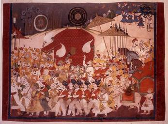 | Keywords: Indian - A Wedding Procession - Walters W883.jpg This is a typical example of a genre that was popular with Rajput princes especially in the 19th century Larger than the average picture these historical paintings record the ceremonies and pageantry of the court occasions that must have been welcome diversions from a dreary existence A large group of such pictures has survived from the reign of that boisterous and bon-vivant Kotah ruler Ram Singh II r 1827-66 Indeed this ruler seems to have been singularly fond of documenting the significant events of his colorful courtly life in equally gay and sumptuous pictures This painting is one such example and depicts a procession in great detail It is a wedding procession as is clear from the litter covered with a red cloth that carries the bride Unless it was a winter day the bride must have literally baked inside for even the small window is well covered That it is a celebratory occasion is further evidenced by the cannons being fired in the upper right corner and the fireworks going off on the upper left The regal trappings and insignias that accompany the draped litter make it clear that this is a royal wedding Ram Singh married at least eight times but this scene may relate to his principal marriage Noteworthy also is the row of marching soldiers in European dress in the foreground The presence of these soldiers is probably the result of the protectorate status bestowed on the state by the British in 1817 1825-50 pigments paper cm 24 77 30 96 accession number W 883 9694 John and Berthe Ford Baltimore date and mode of acquisition unknown Walters Art Museum John Berthe Ford 2001 place of origin Kotah Rajasthan India Walters Art Museum license 2D Kota State Hindu art in the Walters Art Museum Hindu wedding in art Marriage in art of India 1820s paintings from India Baraat Paintings of India in the Walters Art Museum 19th-century watercolor paintings from India |