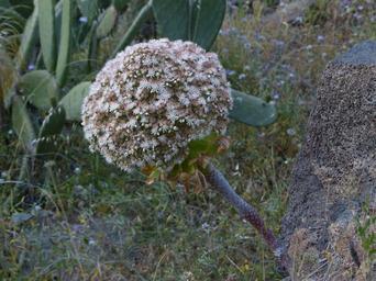 Keywords: inflorescence flowers white spherical roly-poly about globose city aeonium dome-shaped aeonium urbicum aeonium thick sheet greenhouse crassulaceae plant