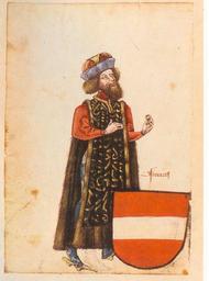 | Keywords: Ingeram Codex 001.jpg Ingeram-Codex der ehemaligen Bibliothek Cotta <br/> Osterrich <br/> Herzog Albrecht VI von Osterreich 1418-1463 Regent von Altösterreich und im Land ob der Enns ab 1440 Die Wappenbücher Herzog Albrechts VI von Österreich Ingeram-Codex d ehem Bibliothek Cotta; hrsg v Charlotte Becher u Ortwin Gamber; Wien; Köln; Graz; 1986 Jahrbuch der Heraldisch-Genealogischen Gesellschaft Adler; Folge 3 Bd 12 Jg 1984/85; ISBN 3-205-05002-9 1459 Hans Ingeram and a so called Exempla-master Reproduction of a painting that is in the public domain because of its age PD-old-100 Ingeram Codex-Albert VI Archduke of Austria Coats of arms of the Dukes of Austria Male fur clothing in art Squirrel clothing in art Fitch clothing in art Fur fashion in 1459 |
