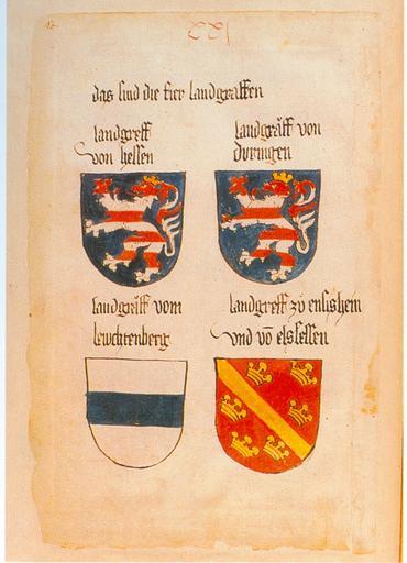 | Keywords: Ingeram Codex 043.jpg Ingeram-Codex der ehemaligen Bibliothek Cotta <br/> XXj <br/> das sind die fier landgraffen <br/> landgreff/von hessen <br/> landgräff von/duringen <br/> landgräff vom/lewchtenberg <br/> landgreff zu ensishein und vo n elssessen Die Wappenbücher Herzog Albrechts VI von Österreich Ingeram-Codex d ehem Bibliothek Cotta; hrsg v Charlotte Becher u Ortwin Gamber; Wien; Köln; Graz; 1986 Jahrbuch der Heraldisch-Genealogischen Gesellschaft Adler; Folge 3 Bd 12 Jg 1984/85; ISBN 3-205-05002-9 1459 Hans Ingeram and a so called Exempla-master Reproduction of a painting that is in the public domain because of its age PD-old-100 Exempla Meister-Reichsverfassung Coats of arms of Alsace Former coats of arms of Hesse Coats of arms of Leuchtenberg family Former coats of arms of Thuringia Lions rampant barry of eight |