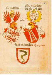 | Keywords: Ingeram Codex 076.jpg Ingeram-Codex der ehemaligen Bibliothek Cotta <br/> Telp <br/> here von badowe Francesco Carrara Herr von Padua +1405 <br/> pa u lus von der laitter/ und here zu pern Paolo della Scala Herr von Verona + um 1440 <br/> ytalia/fry her von runzelyon <br/> Ronciglione Anguillara Freiherr von Ronciglione Die Wappenbücher Herzog Albrechts VI von Österreich Ingeram-Codex d ehem Bibliothek Cotta; hrsg v Charlotte Becher u Ortwin Gamber; Wien; Köln; Graz; 1986 Jahrbuch der Heraldisch-Genealogischen Gesellschaft Adler; Folge 3 Bd 12 Jg 1984/85; ISBN 3-205-05002-9 1459 Hans Ingeram and a so called Exempla-master Reproduction of a painting that is in the public domain because of its age PD-old-100 Exempla Meister-Fremde Herrschaften Historical images of Ronciglione Coats of arms of the House of della Scala Padua in art Bordures gules |