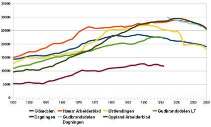 | Keywords: Innlandsavisenes opplagstall 1950-2009.png en Graph showing the inland newspapers circulation from 1950 to 2009 Based on http //www mediebedriftene no/index asp id 78404 http //www mediebedriftene no/index asp id 78404 no Graf som viser de fem før seks største innlandsavisene opplagstall fra 1950 til 2009 Tallene er basert på http //www mediebedriftene no/index asp id 78404 Mediebedriftenes Landsforening Avisene er fra Hedmark Glåmdalen Kongsvinger Hamar Arbeiderblad Hamar Østlendingen Elverum Oppland Gudbrandsølen Lillehammer Tidende Lillehammer Dagningen Lillehammer Gudbrandsølen Dagningen Lillehammer Oppland Arbeiderblad Gjøvik Own Torstein Frogner 2010-04-28 Hedmark Oppland |