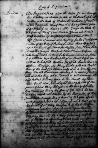 | Keywords: Inquirição de Justiça envolvendo comerciantes com interesses na Madeira, 1777-1779.jpg Inquirição de Justiça envolvendo comerciantes com interesses na Madeira como John Light Banger Londres Setembro de 1777 a Maio de 1779 Documentos da Justiça da Cidade Londres Inglaterra City of London Sessions Sessions Papers - Justices; working Documents SL-PS LMSLPS150890062 p 67 9th September 1777 - 27th May 1779 An Inquisition indented taken for our Sovereign Lord the King at London to wit at the Parish of Saint / Swithin in the Ward of Walbrook in London aforesaid / on the thirteenth Day of March in the eighteenth year / of the Reign of our Sovereign Lord George the Third by / the Grace of God of Great Britain France and Ireland / King Defender of the Faith before Thomas Beach no role / Esqr Coroner of our said Lord the King for the City of London / On View of the Body of Robert Sanders there lying dead / upon the Oath of James Rutherford no role John Elton John / Denis no role the Younger Michael Ellis no role Thomas Messer / John Taylor no role upholsterer John Taylor no role Chinaman John / East no role William Inge no role Robert Hughes Basil Righton no role / William Whitefield no role William Schofield James Spooner / William Slaughter no role and Henry Cooke good and lawful / men of the said City chosen as by Law is directed who / being then and there sworn and charged to inquire for our / said Lord the King when how and in what manner the / said Robert Sanders no role came to his Death say upon / their Oath that John Light Banger late of the / Parish of Saint Mary Islington in the County of Middx / Gentleman not having the Fear of God before his Eyes / but being moved and Seduced by the Instigation of the / Devil on the Seventh Day of March in the year aforesd / with Force and Arms at London aforesaid to wit at / the Parish of St Mary Woolnorth in the Ward of / Langbourn in London aforesaid in and upon the said / Robert Sanders no role is the Peace of God and one said Lord / the King then and there being feloniously wilfully / and of his malice afore thought did make an Assault / and that the said John Light Banger with a certain / Cane of the value of one Shilling which he the said John Light Banger in his right Hand then and there / had and hold him the said Robert Sanders no role and upon / the Face Neck Shoulders and Chest of the said Robert Rui Carita 48067 1925 author PD-old-70 Files of Funchal uploaded by Darwinius Funchal in the 1770s 1777 documents Documents of England Documents in English Inquisitions City of London Documents related to Funchal John Light Banger Commerce in Funchal 1777 in Portugal 1777 in England |