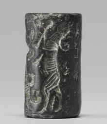 | Keywords: Inscriptions - Walters 42582 - Side E.jpg The depicted scene includes a lion and a griffin both on hind legs attacking a horned quadruped The horned quadruped's body faces the lion but its head is turned to face the griffin Behind the griffin is another figure the top of which is difficult to read but the legs on which it stands are that of a bull bull-man A cuneiform inscription in two registers borders the scene date Old Babylonian black stone cm 2 5 1 3 h x diam accession number 42 582 12556 Sadie Jones Mrs Henry Walters New York date and mode of acquisition unknown Sale Joseph Brummer New York 1941 Walters Art Museum 1941 by purchase Museum purchase 1941 Inscription place of origin Egypt Walters Art Museum license Cylinder seals in the Walters Art Museum Art of the ancient Near East Walters cylinder seal 42582 Walters Art Museum cylinder seals with cuneiform Media contributed by the Walters Art Museum needs category review |