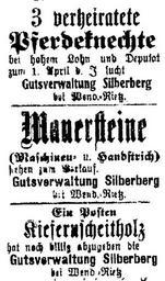 | Keywords: Inserate Gutsverwaltung Silberberg 1910.jpg Anzeigen der Gutsverwaltung Silberberg im Amtlichen Kreisblatt aus dem Jahr 1910 Silberberg ist ein Wohnplatz der Gemeinde Bad Saarow im Landkreis Oder-Spree in Brandenburg Der ehemalige Gutsbezirk liegt in einer Hügellandschaft rund 1 5 Kilometer westlich des Scharmützelsees und wurde 1928 nach Bad Saarow eingemeindet Advertisements of the manor administration Silberberg from 1910 Silberberg is a part settlement estate; german Wohnplatz of Bad Saarow District Oder-Spree Brandenburg Germany The former manor and manor district german Gutsbezirk is situated in a hilly country approximately 1 5 kilometers west of the Scharmützelsee Silberberg was incorporated into Bad Saarow in 1928 Amtliches Kreisblatt für den Kreis Beeskow-Storkow Wiedergegeben aus Hans Werner Hintze Zusammenstellung und Herausgabe Saarow-Pieskow vor 100 Jahren in der Kreiszeitung Entstehung der Villenkolonie Bau der Kreisbahn und sonstiges Geschehen Hefte zur Ortsgeschichte von Bad Saarow Heft 48 Alt-Golm 2008 S 43 1910 Author Silberberg Bad Saarow Newspaper clippings Newspaper advertising Advertisements in Brandenburg Advertising in print media 1910 advertisements PD-old |